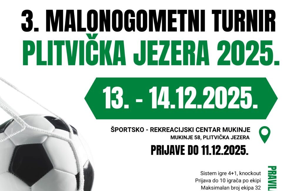 U Športsko rekreacijskom centru Mukinje 13. i 14. prosinca održat će se 3. malonogometni turnir Plitvička jezera 2025. Organizator je Nacionalni park Plitvička jezera u suradnji s klubovima NK Lika 95 i NK Plitvice. Prijave se otvaraju 8. studenoga, a broj ekipa je ograničen pa se preporučuje ranija prijava. Prijave i kotizacija Kotizacija iznosi 100 eura po ekipi. Uplata ide na...